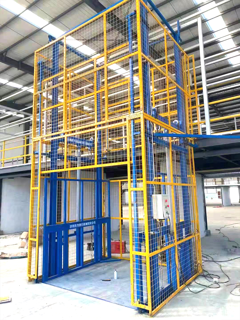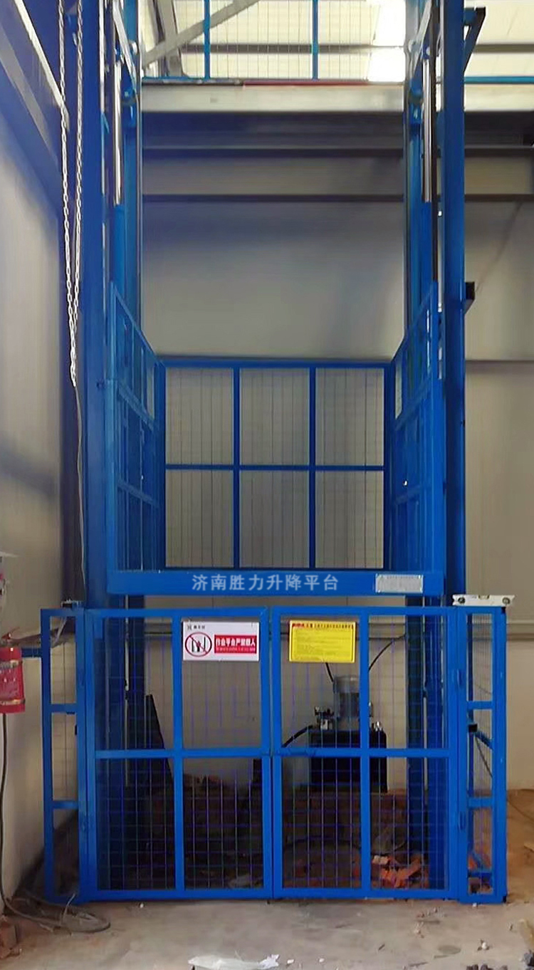 电动液压货物提升机适合于有二层及以上工业厂房、仓库、超市等多楼层间的货物传输。液压升降货梯
