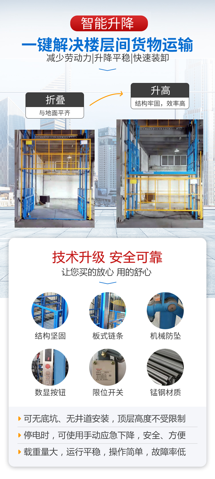 6、液压升降货梯增加机械防坠,防止平台坠落。 液压升降货梯
