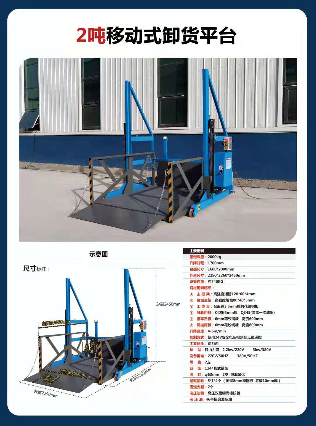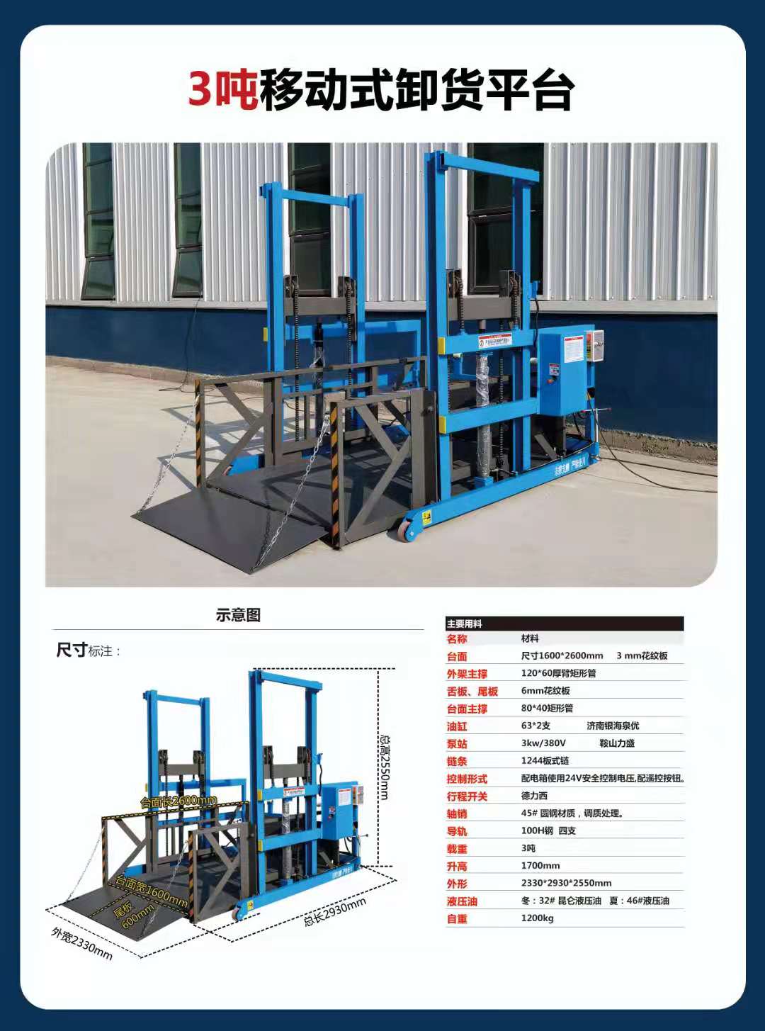 卸货柜设备也可以叫做升降式卸货平台,属于可移动升降平台。卸货柜设备拥有移动灵活,升降平稳的特点。被广泛应用于集装箱与叉车等搬运车辆配套进行货物的快速装卸等。卸货柜平台的操作简单,把平台移动至需要装卸货物的车辆尾部,把叉车等货物放入工作台面上,一人通过无线遥控或工作台面上的按钮即可轻松把叉车等货物升高至与车尾同等高度,使叉车与货物轻松快速的驶入车厢内部。