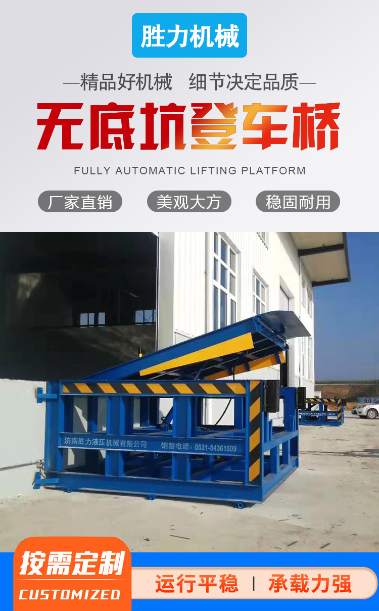 无底坑登车桥是可以不需月台不需挖坑的装卸辅助设备,本设备可根据货车车厢不同高度调节即可调高也可调低,它的高度调节功能使货车与库房的货台之间架起一座桥梁,方便叉车驶入车厢内部进行货物的批量装卸。设备采用进口液压泵站,两侧设有防轧裙板,工作更加安全,仅需单人作业,即可实现货物的快速装卸。固定登车桥可使企业减少大量劳力,提高工作效率,获取更大经济效益。无底坑登车桥被广泛应用在装卸车频繁、车型不一的大型企业、仓库、车站、码头、仓储物流基地、邮政运输、物流配送等。