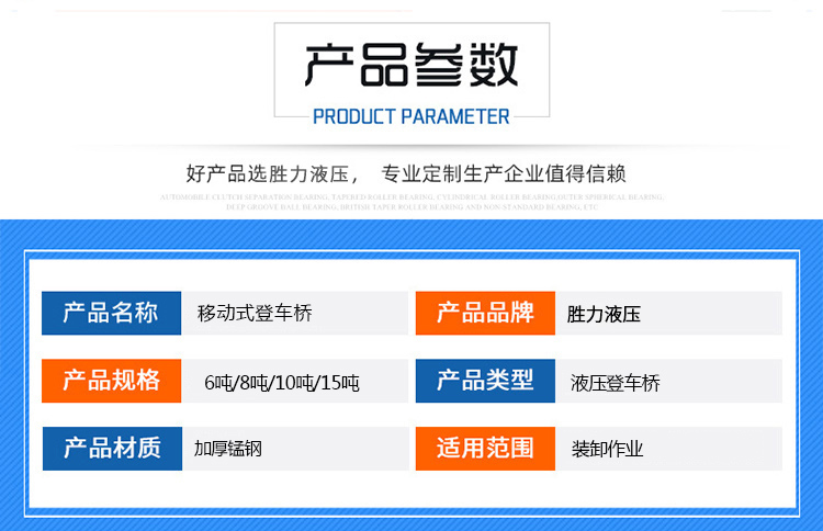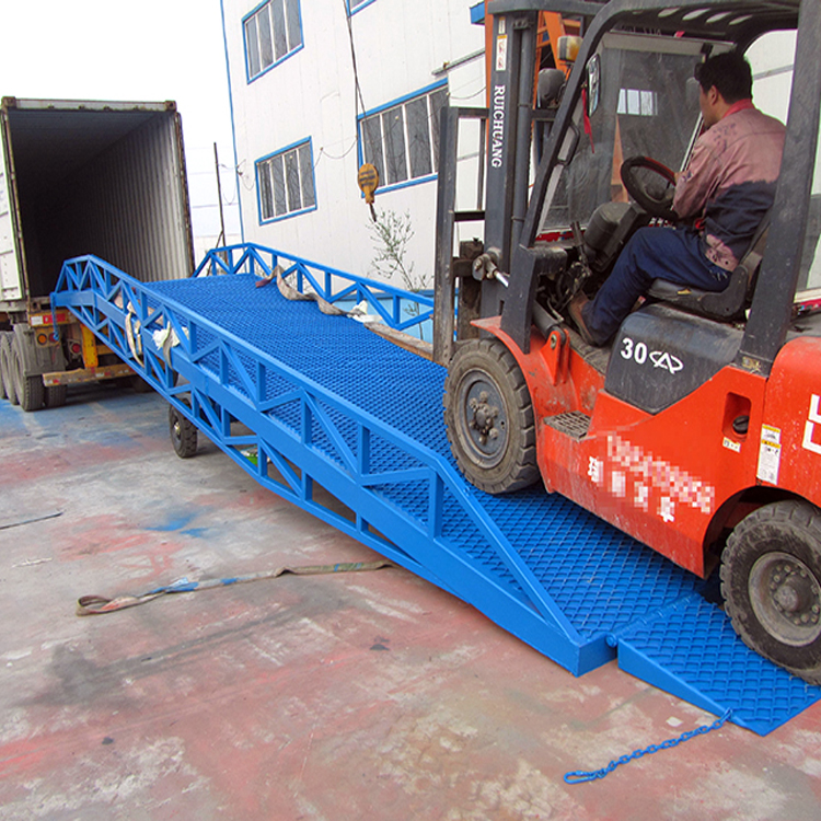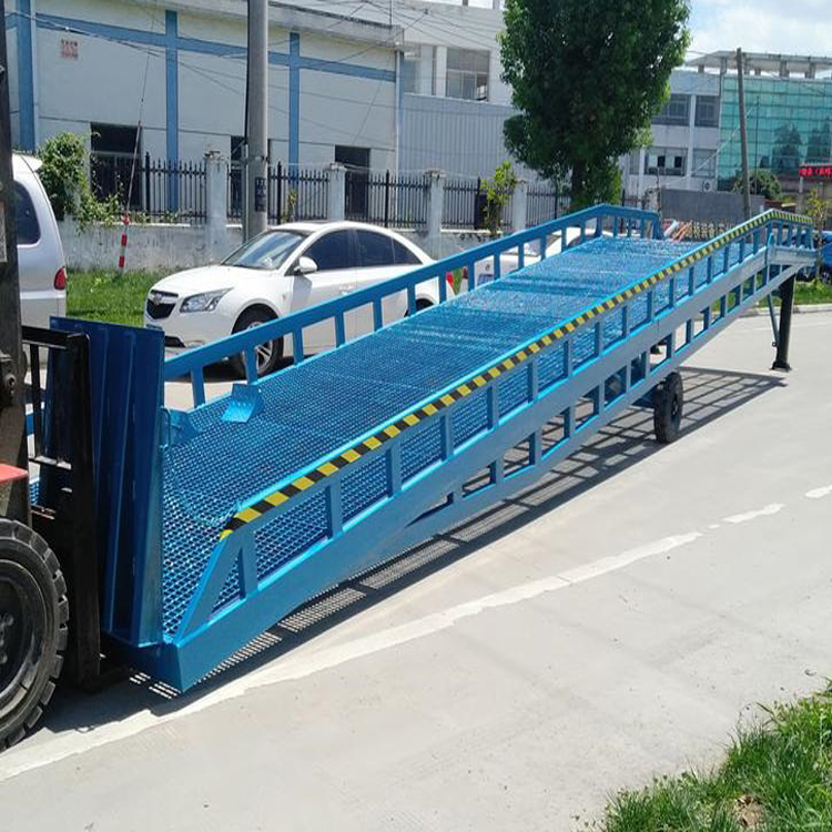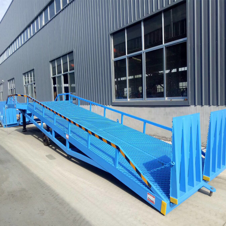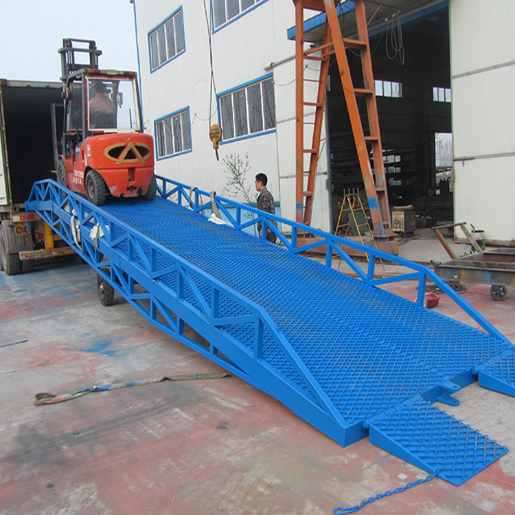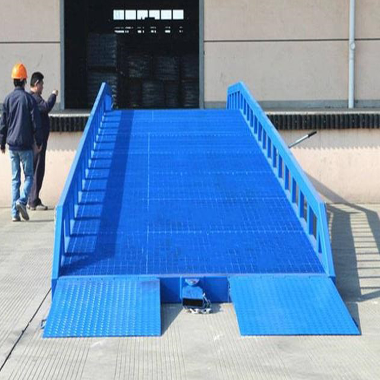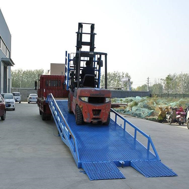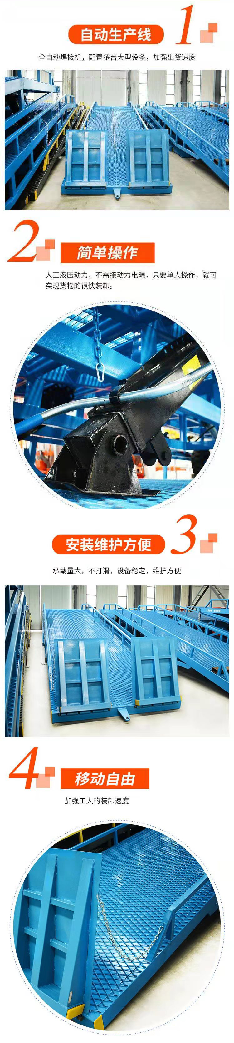 移动式液压登车桥是实现货物快速装卸的专用辅助设备,它的高度调节功能使货车与库房的货台之间架起一座桥梁,叉车等搬运车辆通过它能直接驶入货车内部进行货物的批量装卸,仅需单人作业,即可实现货物的快速装卸。移动式液压登车桥使企业减少大量劳力,提高工作效率,获取更大经济效益。台面均设计为网格状钢板,这种结构能保证具有很好的强度,又具有防滑功能,还能方便地清扫工作台面,使它能经常地保持清洁、美观。移动式登车桥无须外接电源,通过手摇泵做动力能轻松地在其整个调整范围内按50mm的倍数进行高度的调整。可以充分适应各种不同高度的货车.